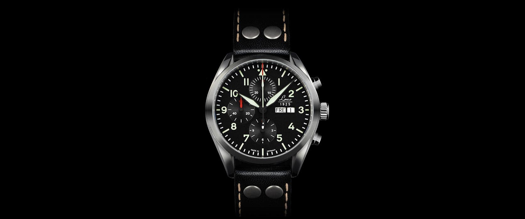 Technik pur, der Chronograph von LACO lässt keine Wünsche offen. Tag- und Datumsanzeige, Minuten und Stundenzähler, Stoppsekunde, separater, dezentraler Sekundenzeiger.