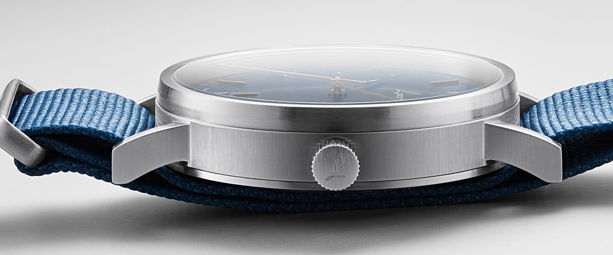 - Blau mit Sonnenschliff, 12 Indexe und Minuterie im Bauhausstil