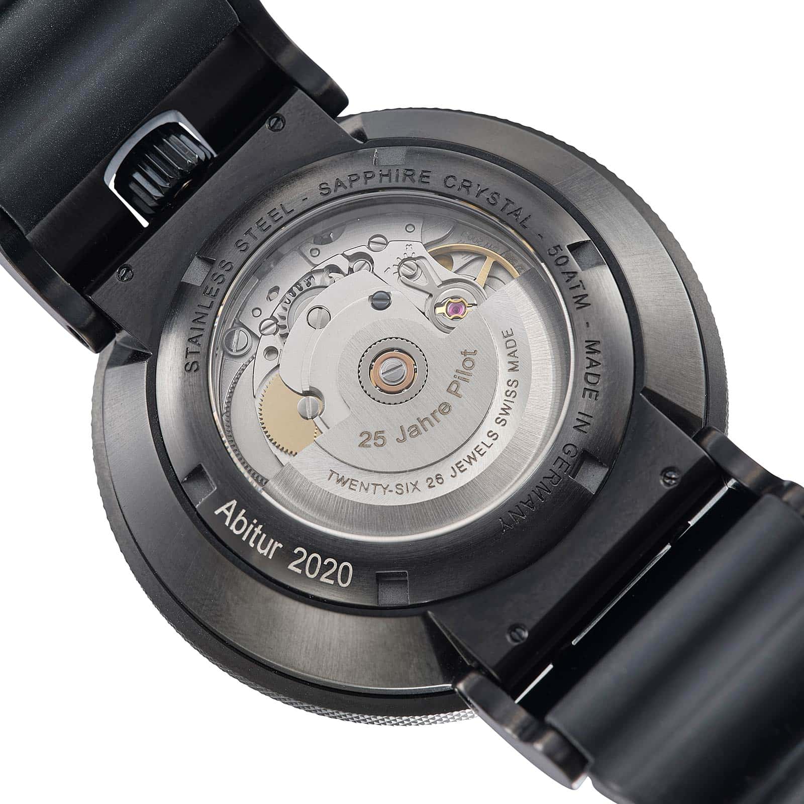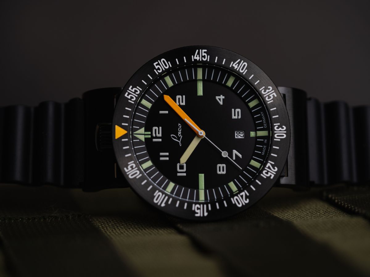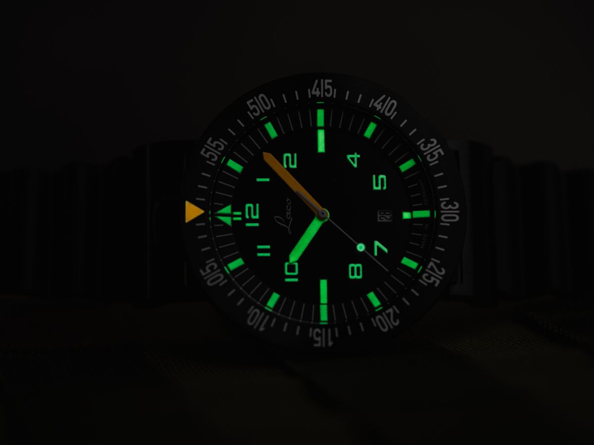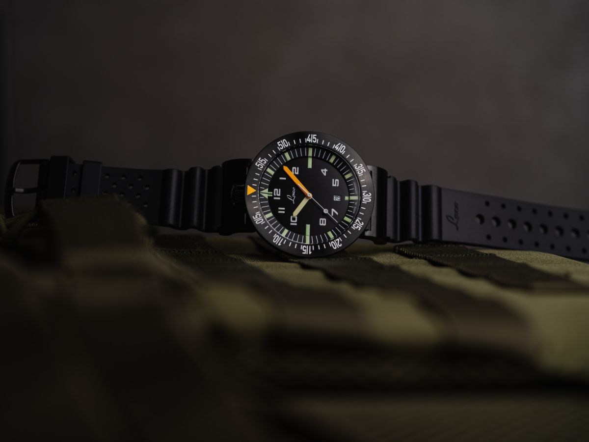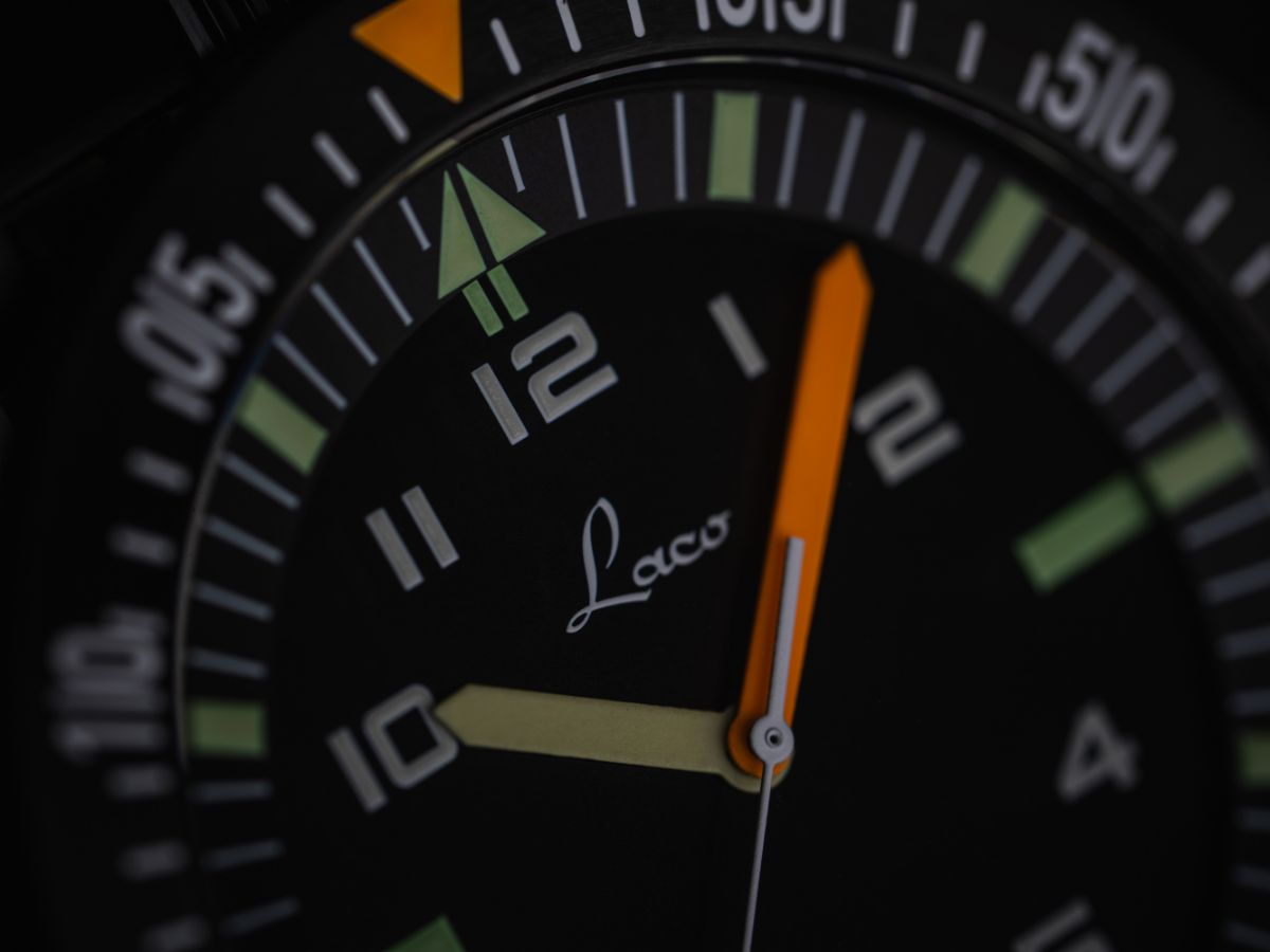 Das Automatikwerk Laco 200, basierend auf dem Schweizer Kaliber Sellita SW 200, arbeitet in jeglichen Situationen präzise. Im Gegensatz zu anderen Uhren mit drehbarer Lünette erfüllt der Drehring eine Countdown-Funktion und zählt daher rückwärts gegen den Uhrzeigersinn. Das ist besonders zur Koordination gemeinsamer Einsätze praktisch.