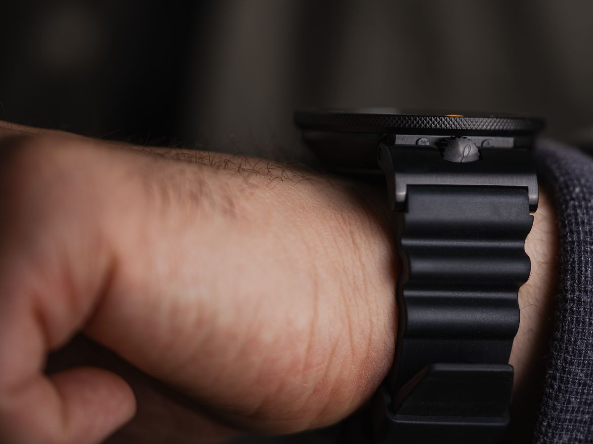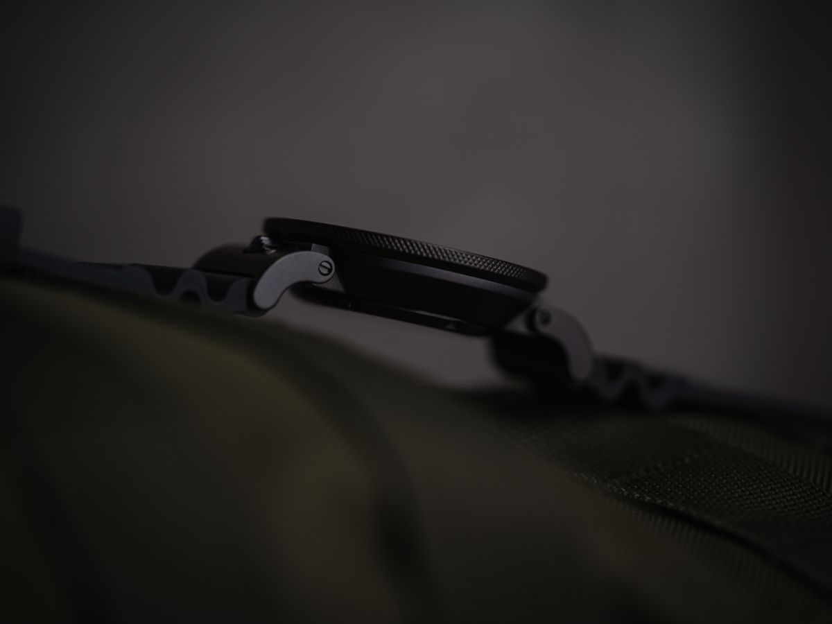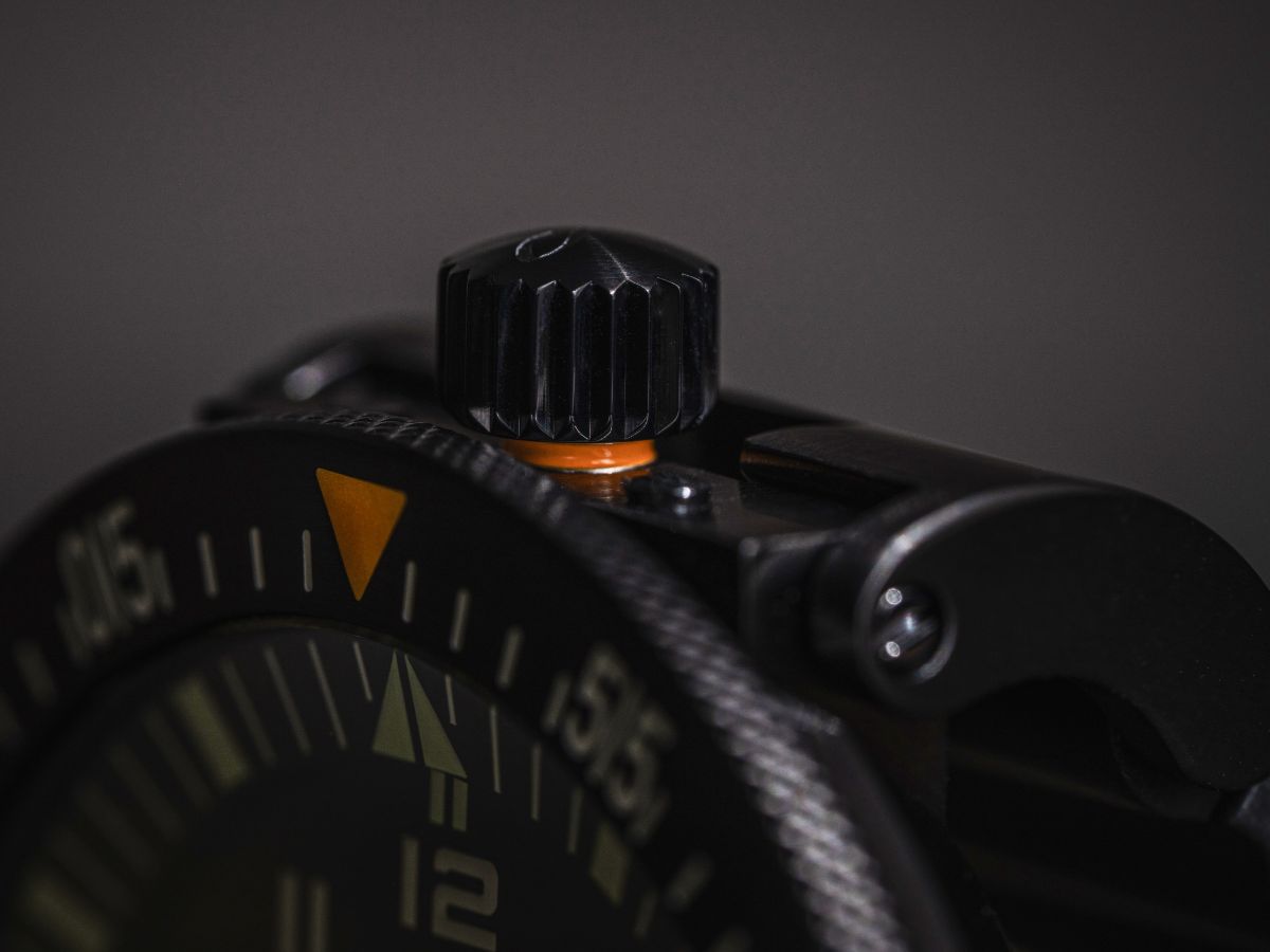 Das Doppelgelenk zwischen Gehäuse und Band bietet Platz für die empfindliche, verschraubte Krone. Diese ist ganz unkonventionell auf der 12-Uhr-Position in das Armband integriert und somit vor äußeren Einflüssen geschützt. Gleichzeitig schmiegt sich die Uhr dadurch perfekt ans Handgelenk an und erhöht den Tragekomfort. Zudem gewährleistet die verschraubte Krone eine Wasserdichtigkeit bis 50 ATM.