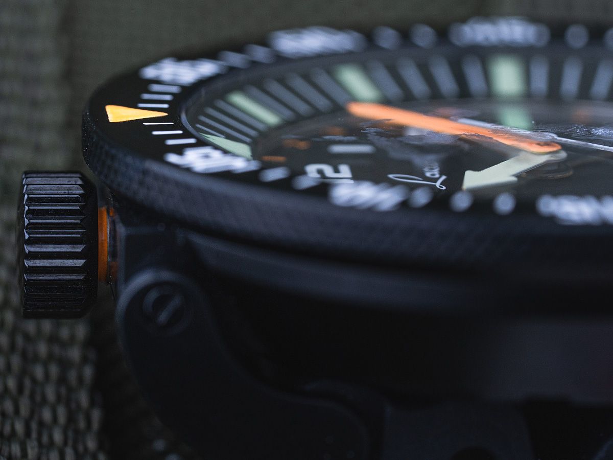 flaches Saphirglas, verschraubte Krone bei 12 Uhr, einseitig drehbare Countdownlünette (Edelstahl), flexible Endstücke, verschraubter Edelstahlboden - Zifferblatt: