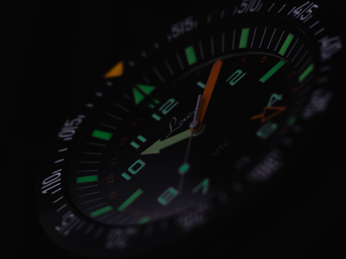 - Stundenzeiger mit Leuchtmasse Superluminova C3 belegt, Minutenzeiger mit Superluminova Orange belegt, Sekundenzeiger weiß lackiert und mit Superluminova C3 ausgelegt, UTC Zeiger mit skelettierter Pfeilspitze Superluminova orange