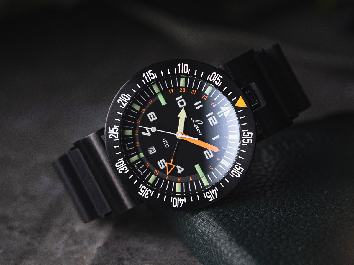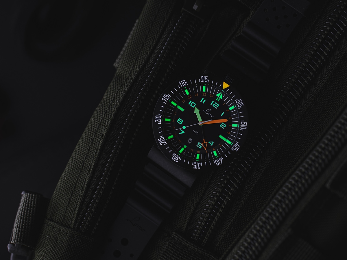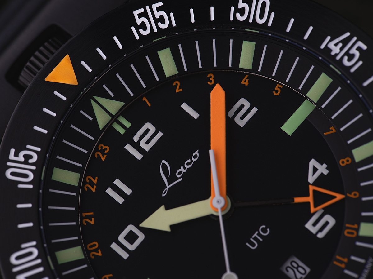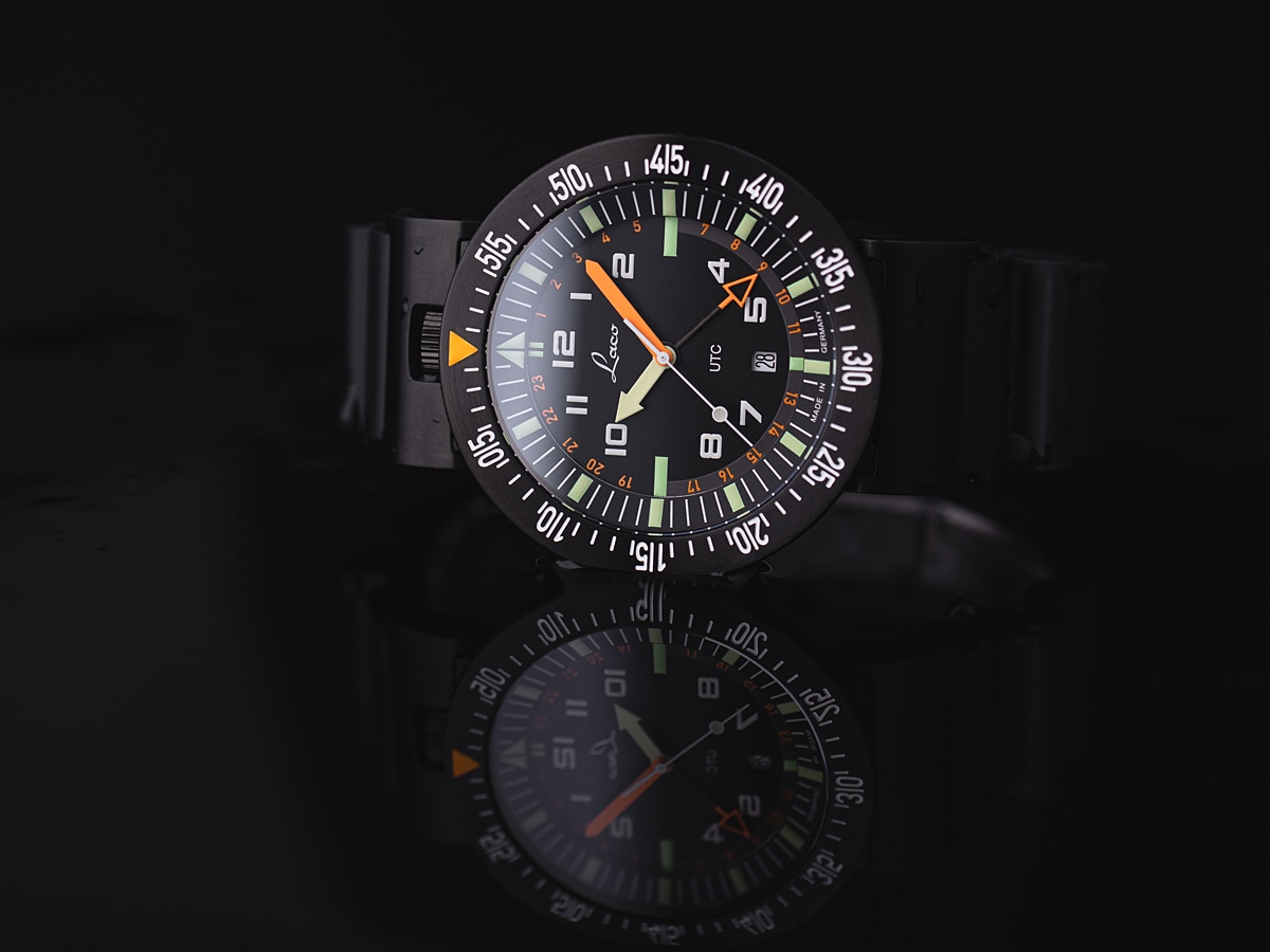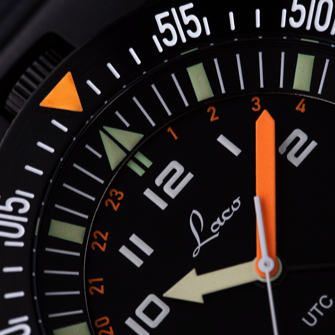 - Stundenzeiger mit Leuchtmasse Superluminova C3 belegt, Minutenzeiger mit Superluminova Orange belegt, Sekundenzeiger weiß lackiert und mit Superluminova C3 ausgelegt, UTC Zeiger mit skelettierter Pfeilspitze Superluminova orange
