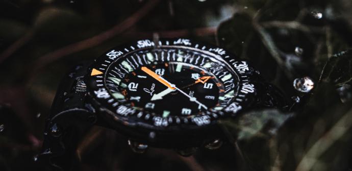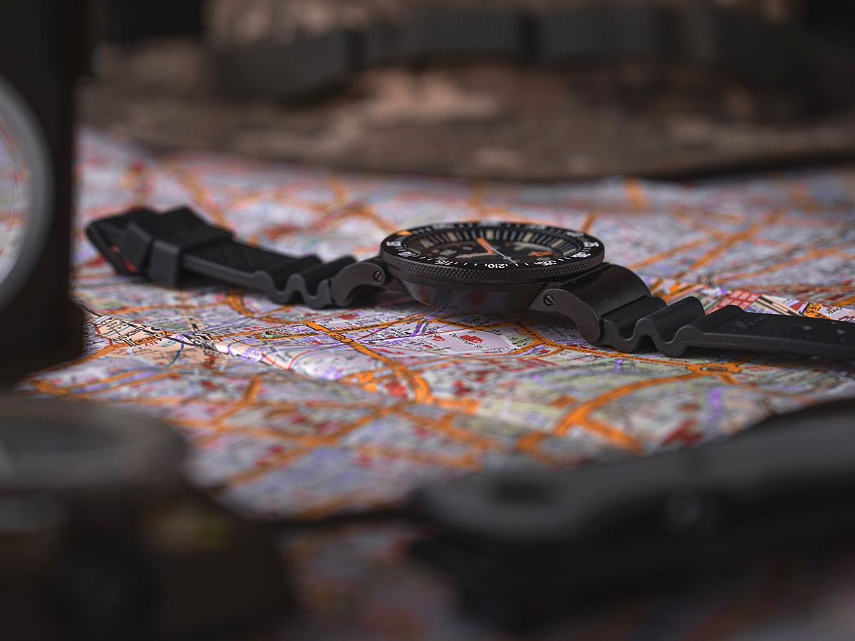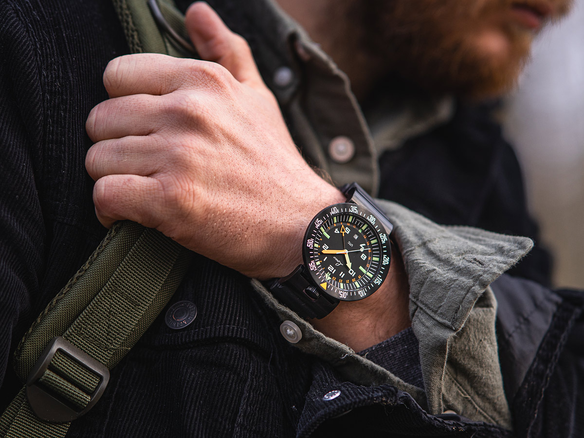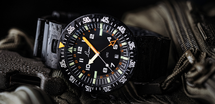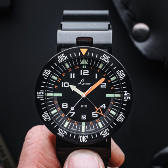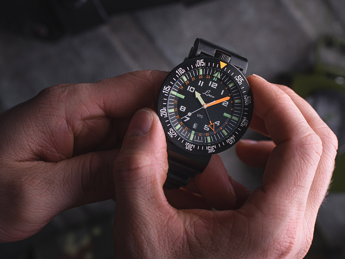 - Stundenzeiger mit Leuchtmasse Superluminova C3 belegt, Minutenzeiger mit Superluminova Orange belegt, Sekundenzeiger weiß lackiert und mit Superluminova C3 ausgelegt, UTC Zeiger mit skelettierter Pfeilspitze Superluminova orange