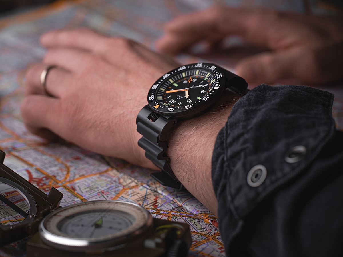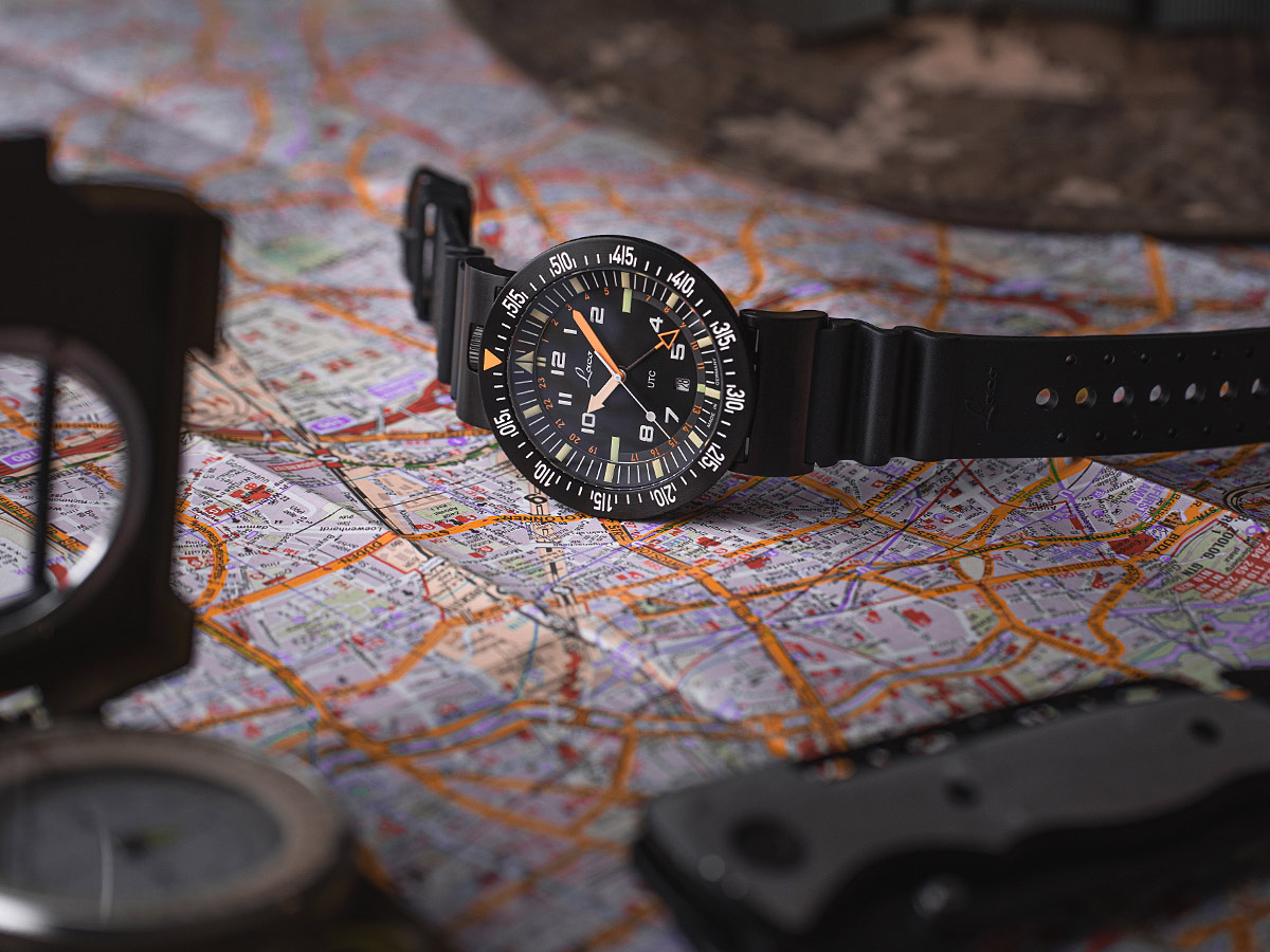 - Schwarz matt, Indexe mit Leuchtmasse Superluminova C3 belegt, weiße Minuterie, Ziffern 1 - 23 für zweite Zeitzone Orange gedruckt