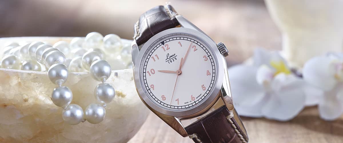 - cremefarbenes Zifferblatt, rosefarbene Ziffern