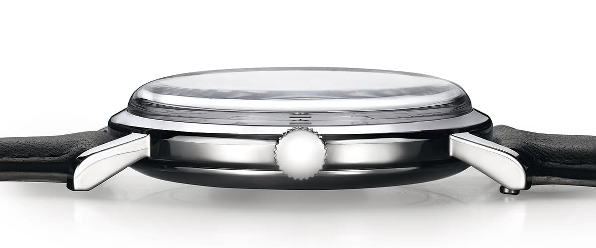 - Edelstahl poliert, Mineralglas, Boden mit gehärtetem Mineralglas, 5 ATM, Ø 34 mm, 18 mm Bandanstoß