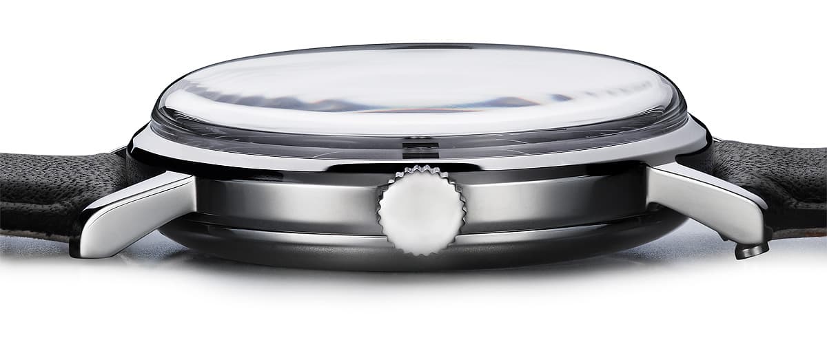- Edelstahl poliert, Mineralglas, Boden mit gehärtetem Mineralglas, 5 ATM, Ø 34 mm, 18 mm Bandanstoß