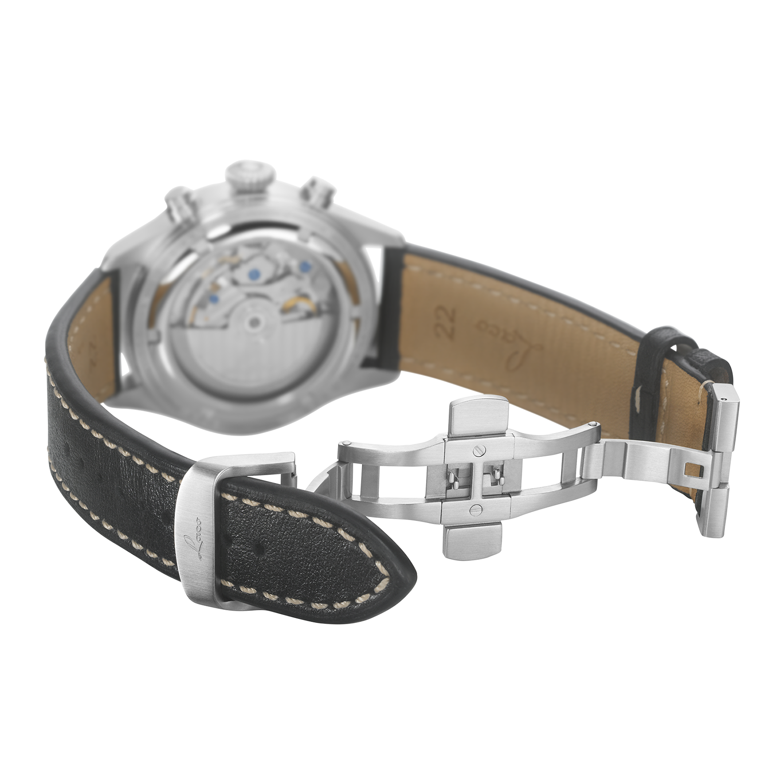 The folding clasp can also be retrofitted to most Laco leather straps. A small integrated pin is fixed into one of the strap holes, allowing the strap length and fit to be adjusted easily.