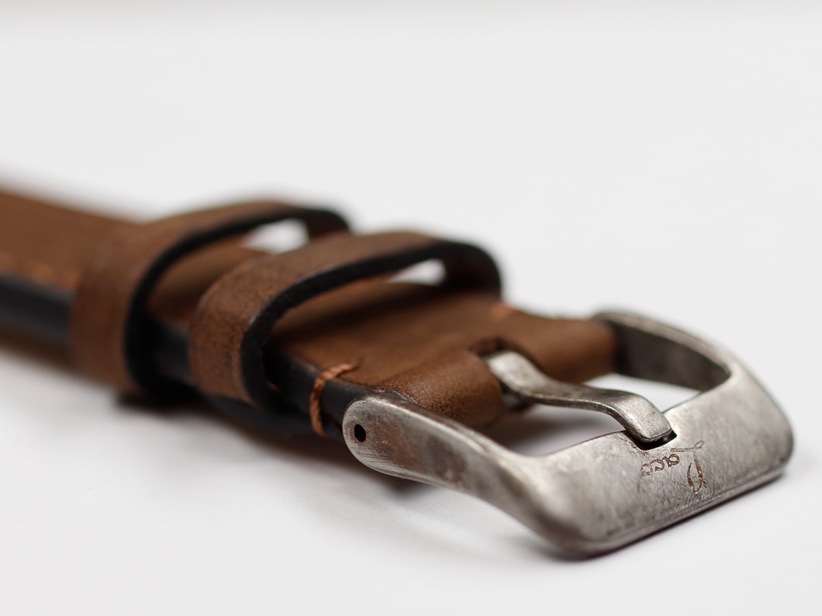 The dark brown vintage leather strap gives your watch an even more authentic vintage look. The high-quality leather with two rivets on each side of the strap emphasizes the robust and unique character of every pilot's watch. The highlight is the aged buckle, which together with the manual aging of the strap fits even better to your Laco "Erbstück".