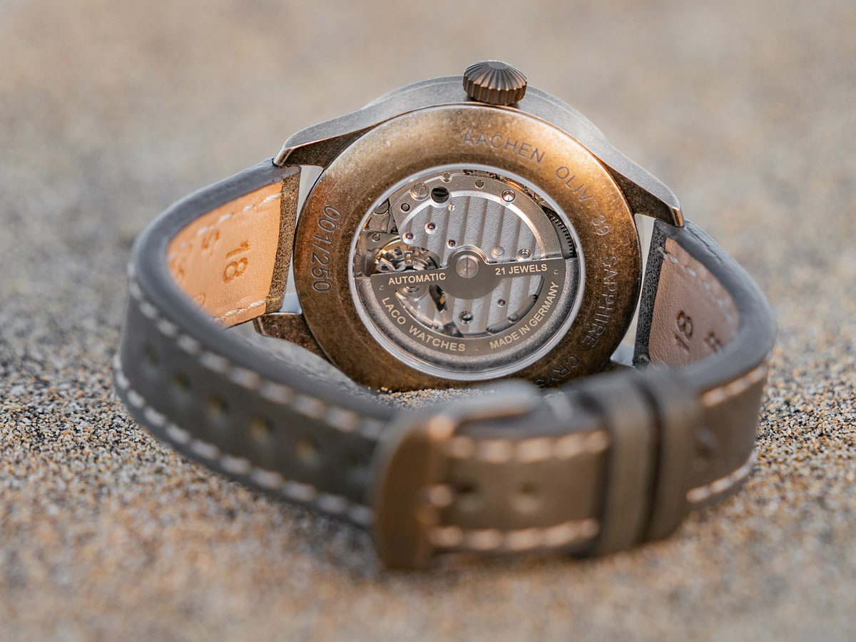 stainless steel case with bronze coloured PVD coating, sapphire crystal