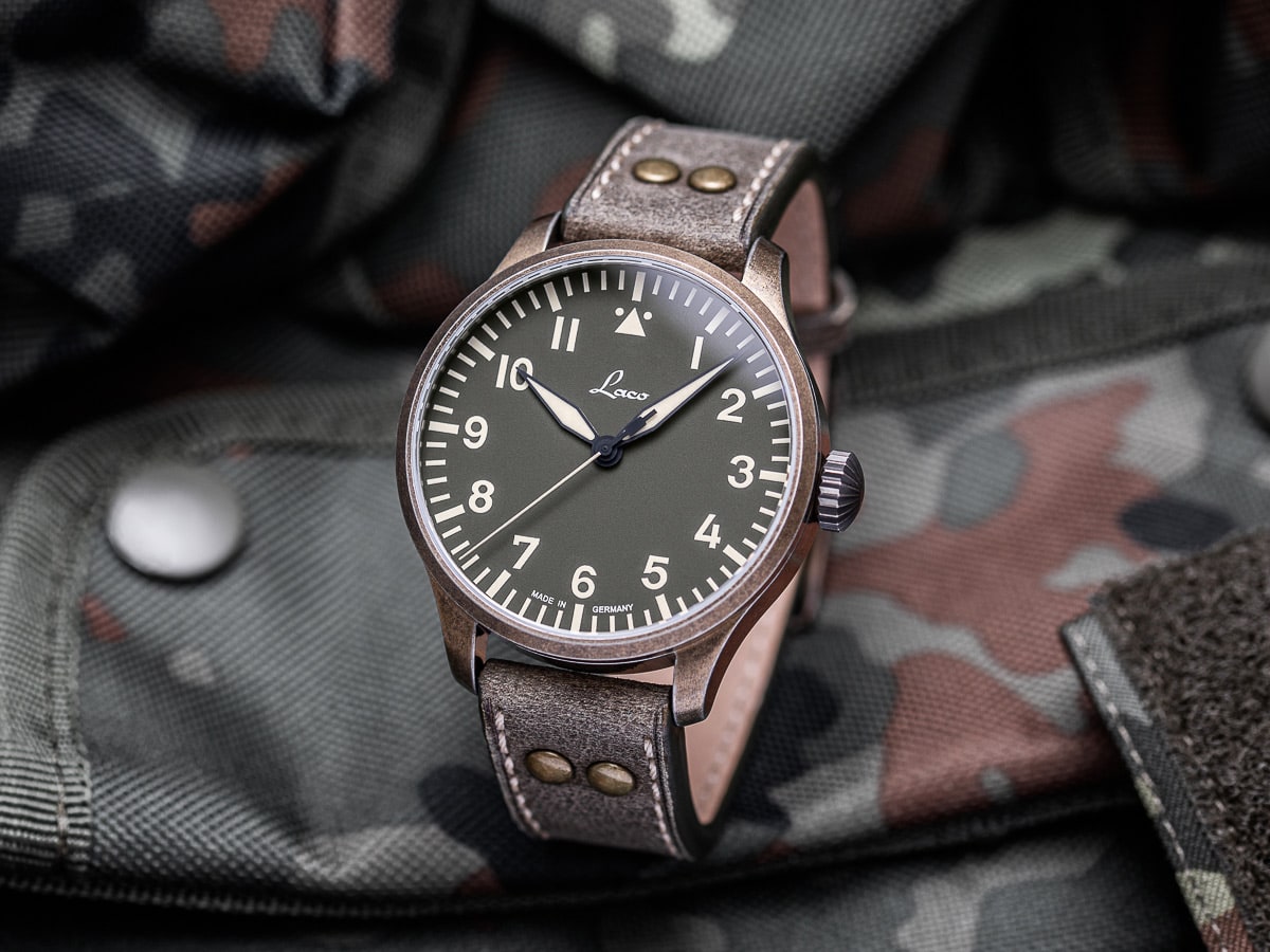 The olive dial features the perfect backdrop for the functional typography, with striking hands and numerals which has been associated with the well-known Laco navigator watches from the 1940s. In authentic style, the luminous colour used for the numbers and hands is Superluminova "Old Radium", which has a vintage brown shade during the day, but glows bright green in the dark.