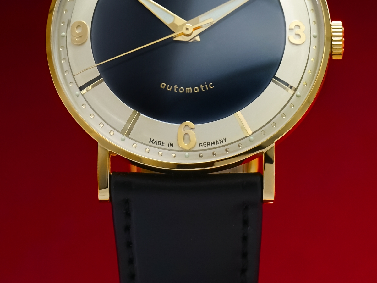 - Matte black dial with champagne-colored outer ring, applied gold-colored numerals, recessed indices,