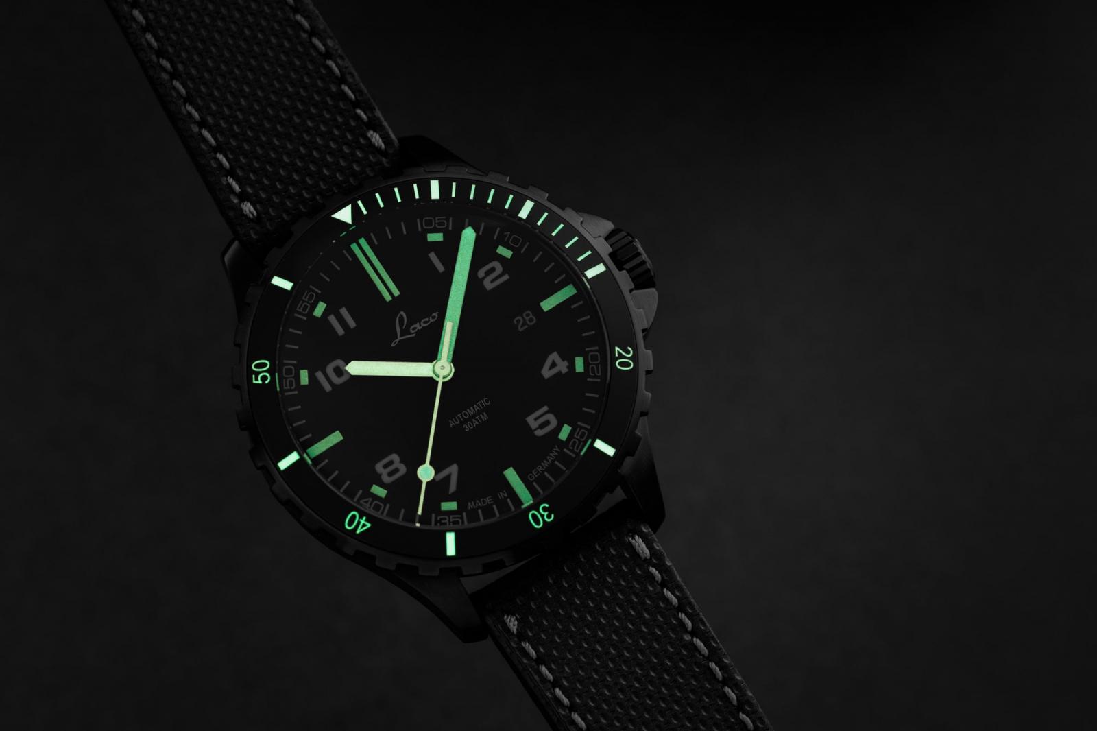 - Black mat, indexes with luminous material Superluminova, white arabic numerals and minute track