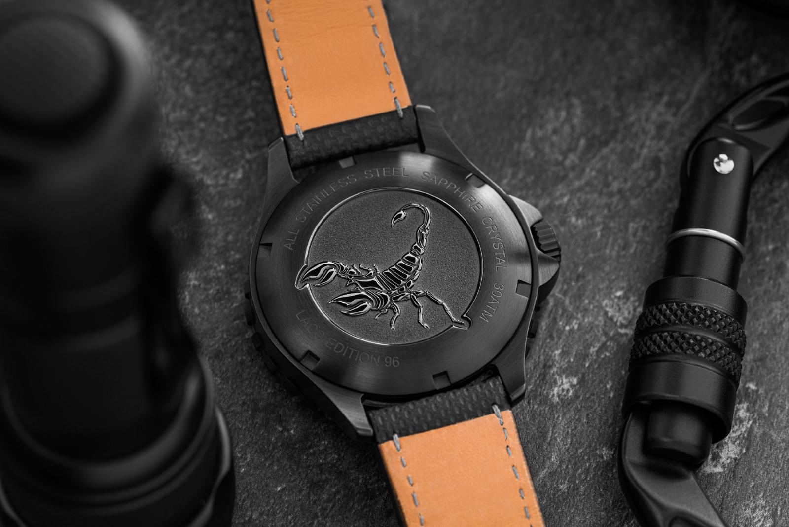 - stainless steel case, black PVD plated, double domed and anti-reflective sapphire crystal, screwed case back with scorpion relief, protected and screwed crown, unidirectional rotating ceramic bezel, indexes with luminous material Superluminova