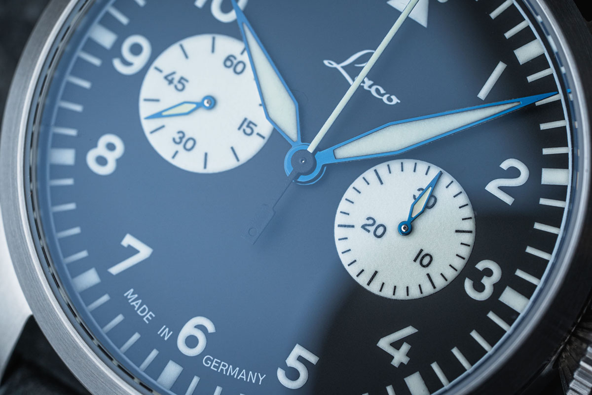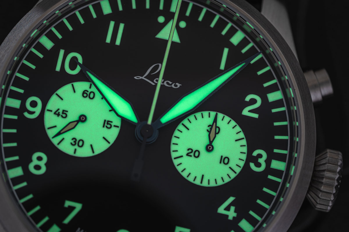 - Black dial, numerals and indices covered with Superluminova C3, totalisers at 3 and 9 o'clock completely covered with Superluminova C3