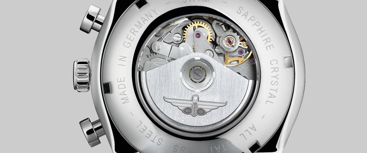 - ETA 7750 with day/date indication at 3, 28.800 (4Hz), customized with engraved logo of Motor Circus