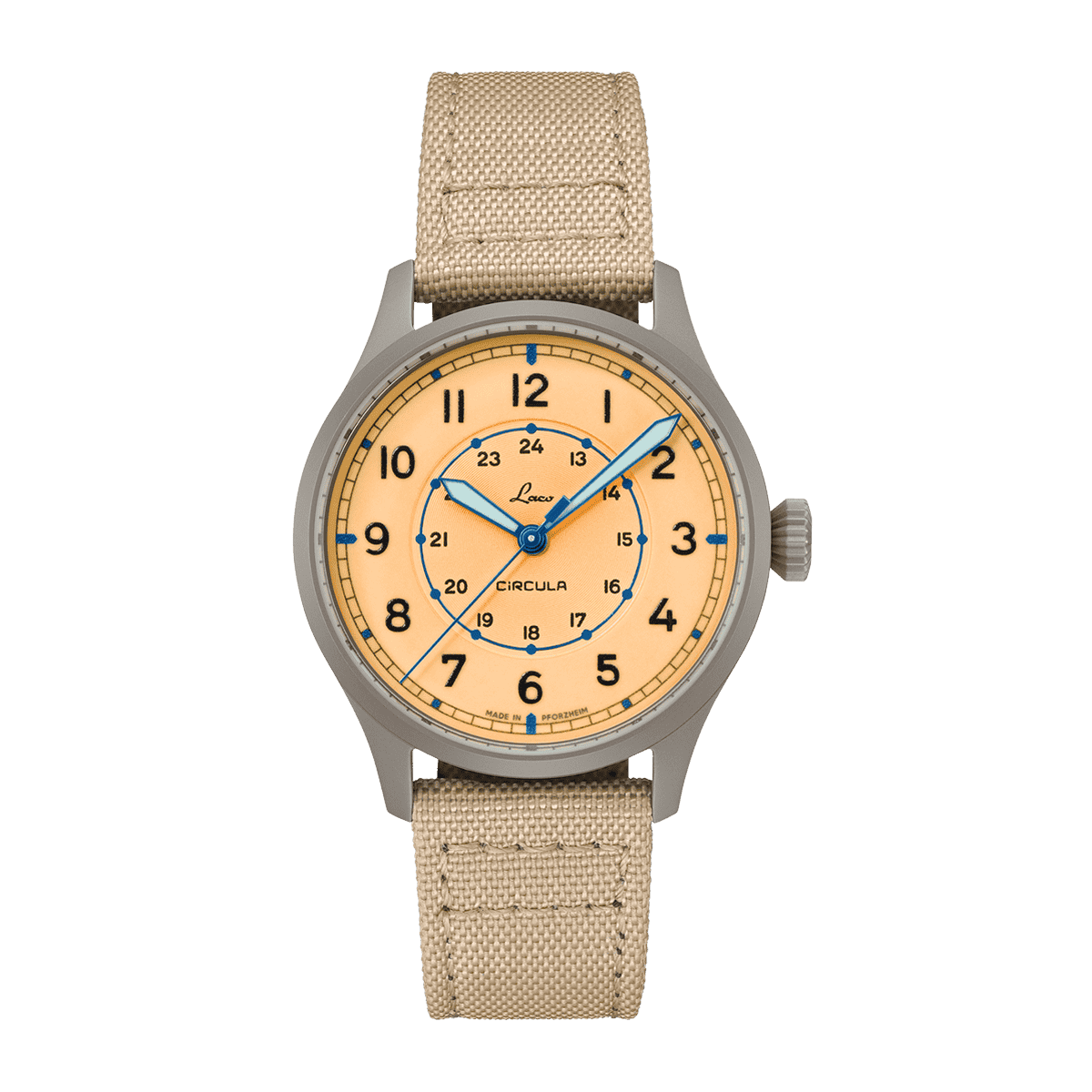 - Sand-colored sailcloth strap with genuine leather lining, quick-release spring bars, dark buckle, 20 mm lug width