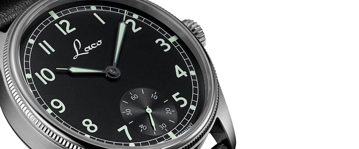 - handwinding movement Laco 98 bridges with Côtes de Genève, thermical blued screws, ratchet wheel and crown wheel with sun ray finish, ratchet wheel with engraved Laco Logo