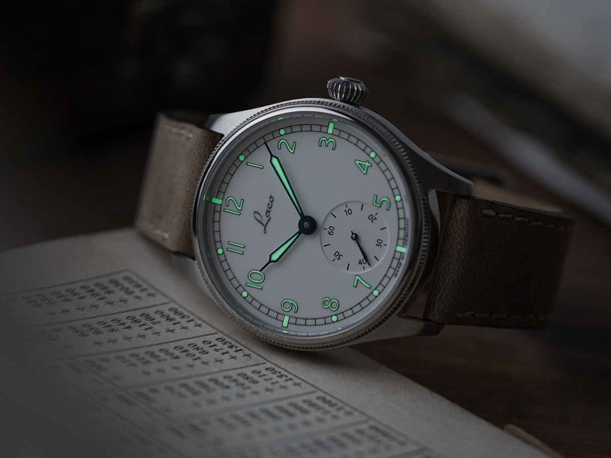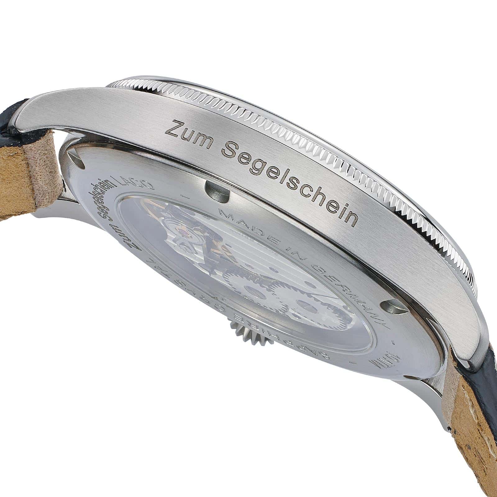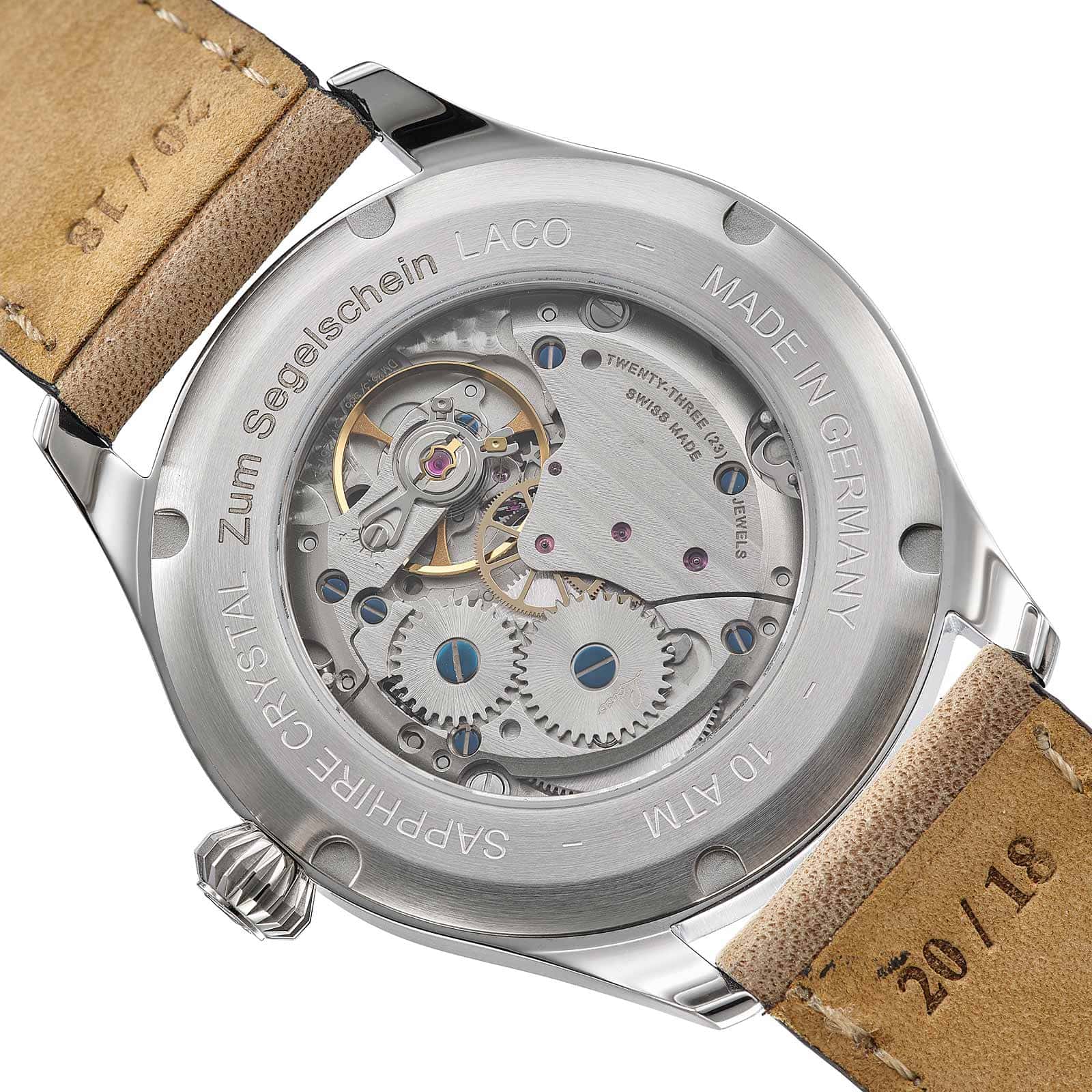 - handwinding movement Laco 261 bridges with Côtes de Genève, thermical blued screws, ratchet wheel and crown wheel with sun ray finish, ratchet wheel with engraved Laco Logo