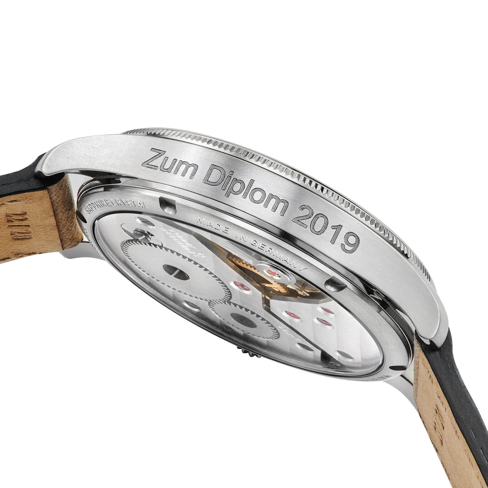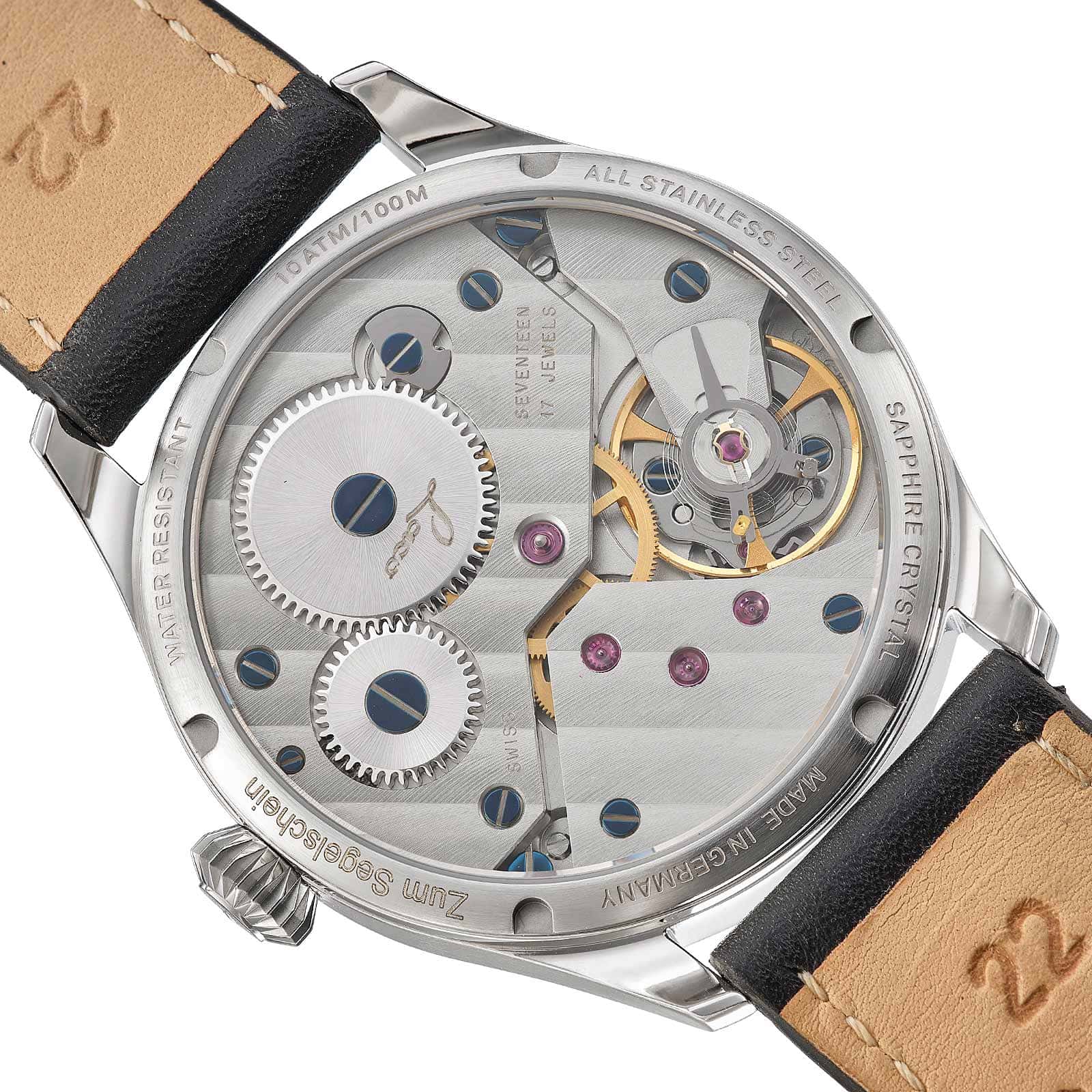 - handwinding movement Laco 98 bridges with Côtes de Genève, thermical blued screws, ratchet wheel and crown wheel with sun ray finish, ratchet wheel with engraved Laco Logo