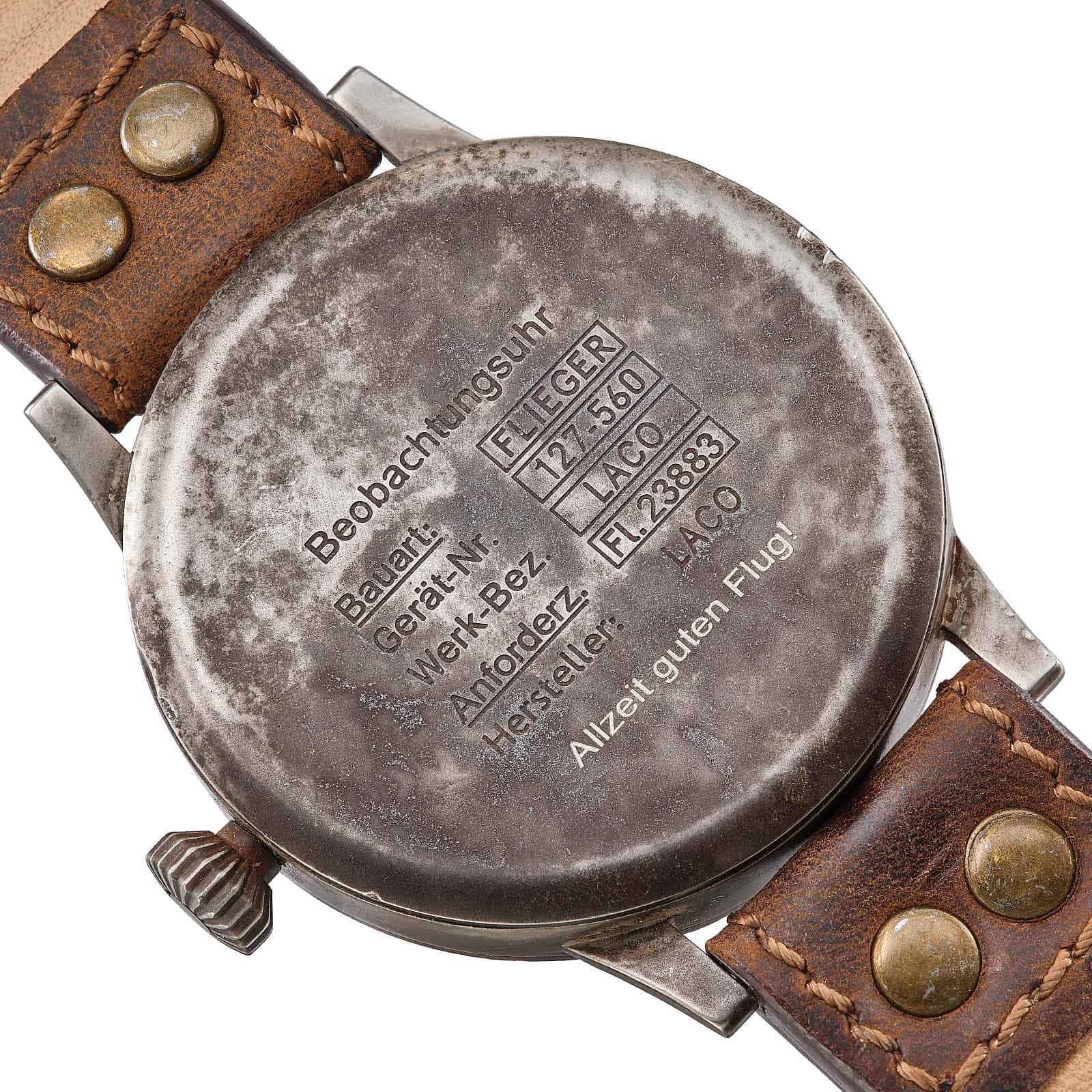 - Stainless steel case, elaborately hand-finished in an antique look with lateral engraving FL23883 and engraved stainless steel back. Every case is absolutely unique. Ø 39 mm, domed and anti-reflective sapphire crystal, solid case back with engraving, Crown execution like original Beobachtungsuhr
