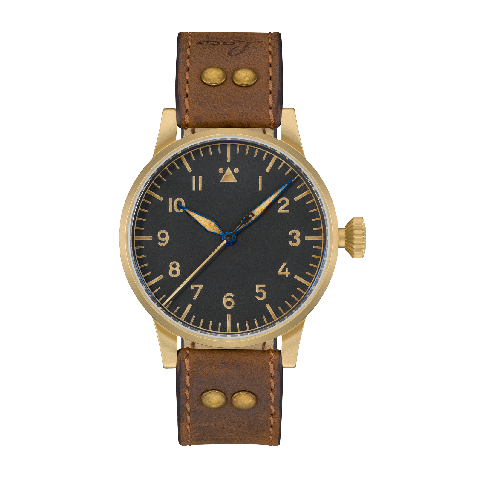 - Closed loop pilot's brown calf leather strap with rivets