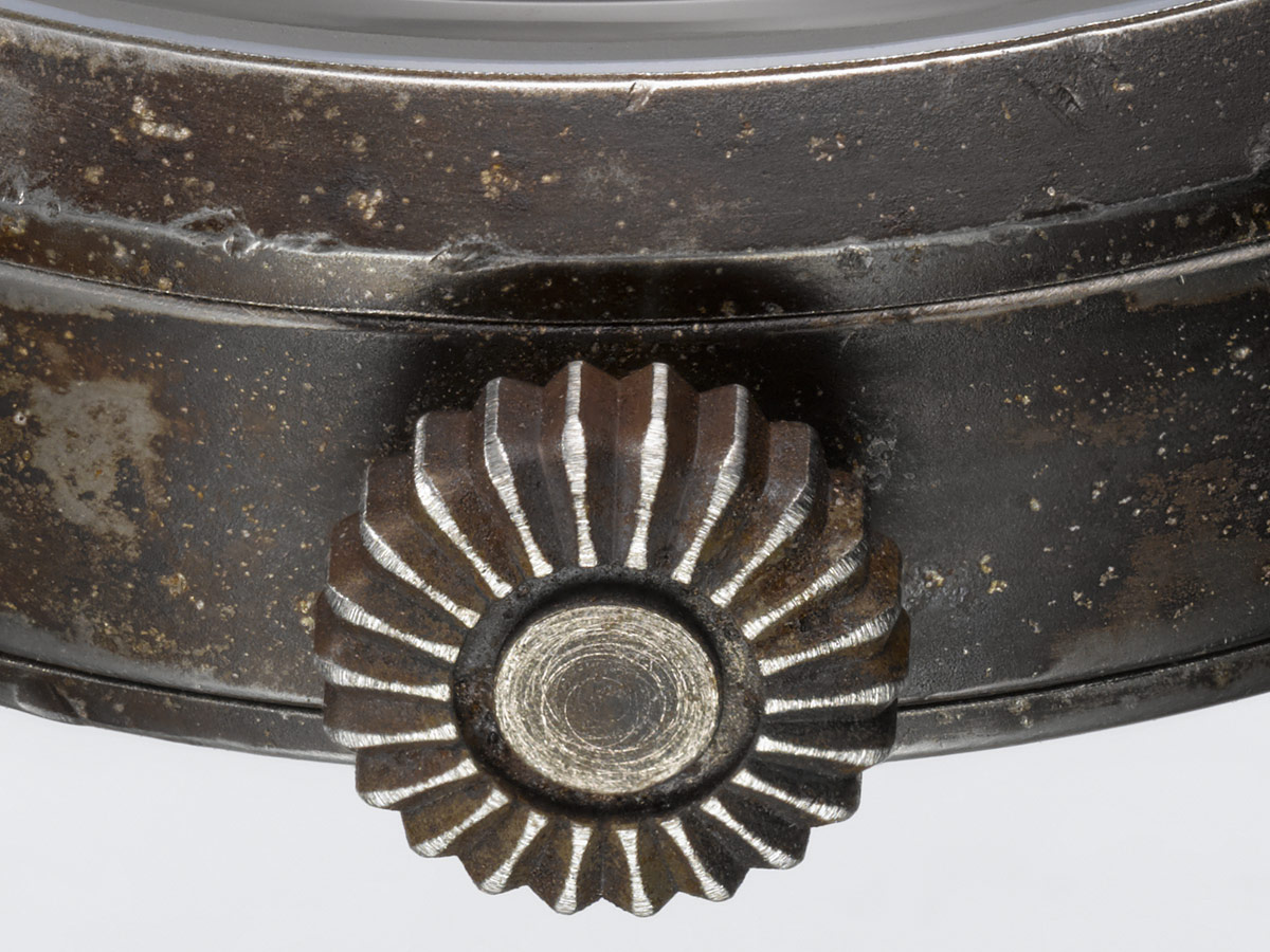 - Stainless steel case, elaborately hand-finished in an antique look with lateral engraving FL23883 and engraved stainless steel back. Every case is absolutely unique. Domed and anti-reflective sapphire crystal, solid case back with engraving, Crown execution like original Beobachtungsuhr