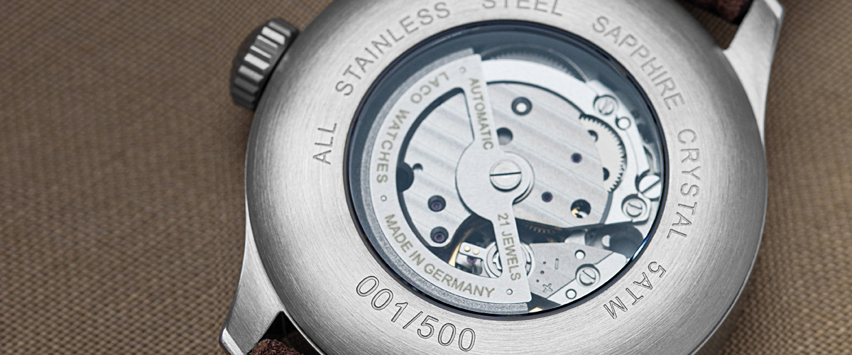 On the back, a sapphire crystal back provides a view of the Laco 21 automatic calibre, which is based on the Miyota 821A. Unlike the standard version, the movement will be equipped with a second stop function for these model. Also on the back is the engraved serial number of the Limited Edition. The "Augsburg Taupe" embodies authentic instrument aesthetics in a contemporary design.