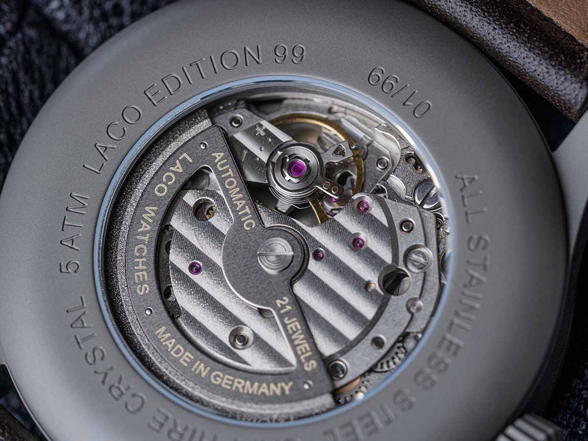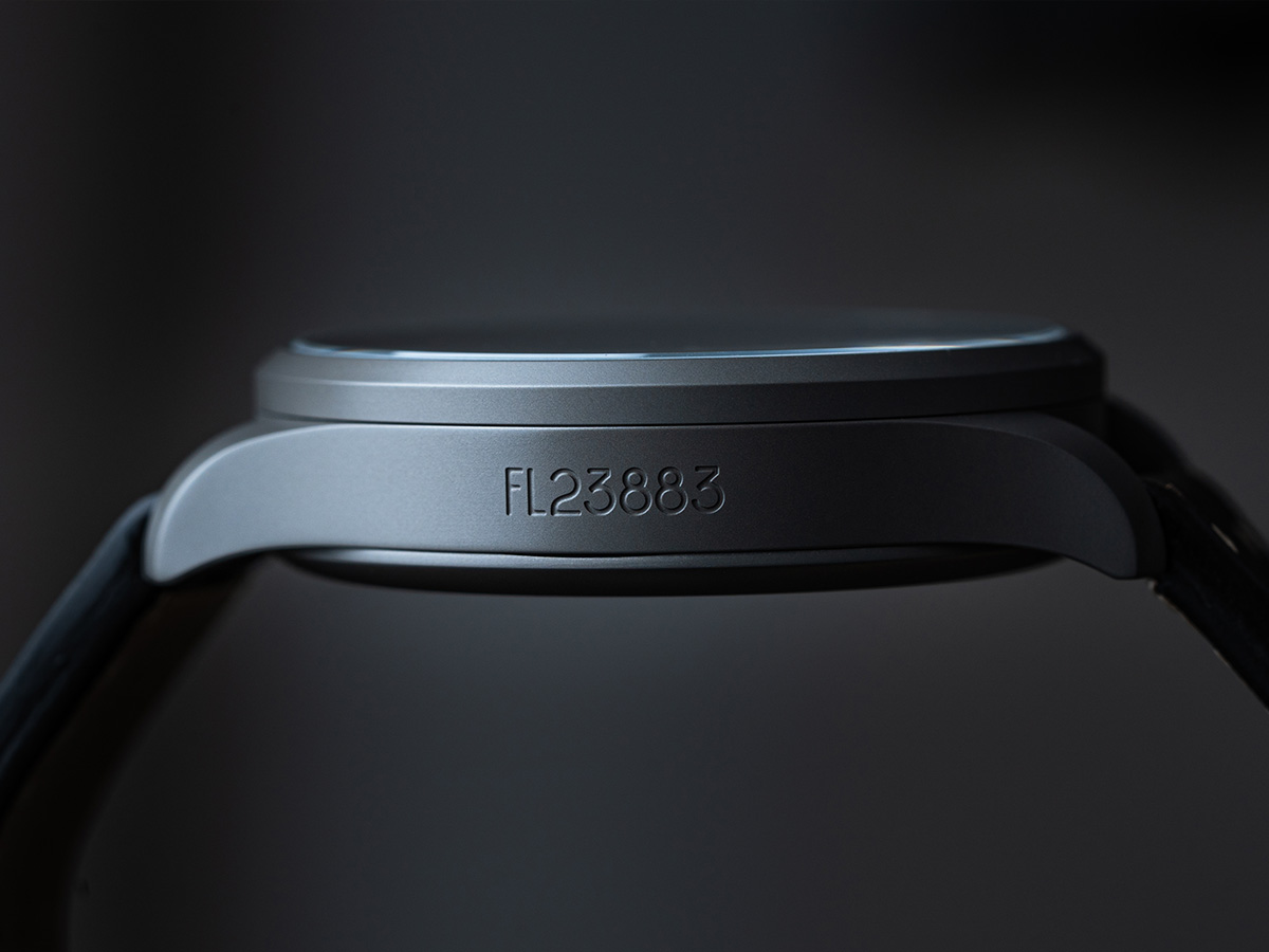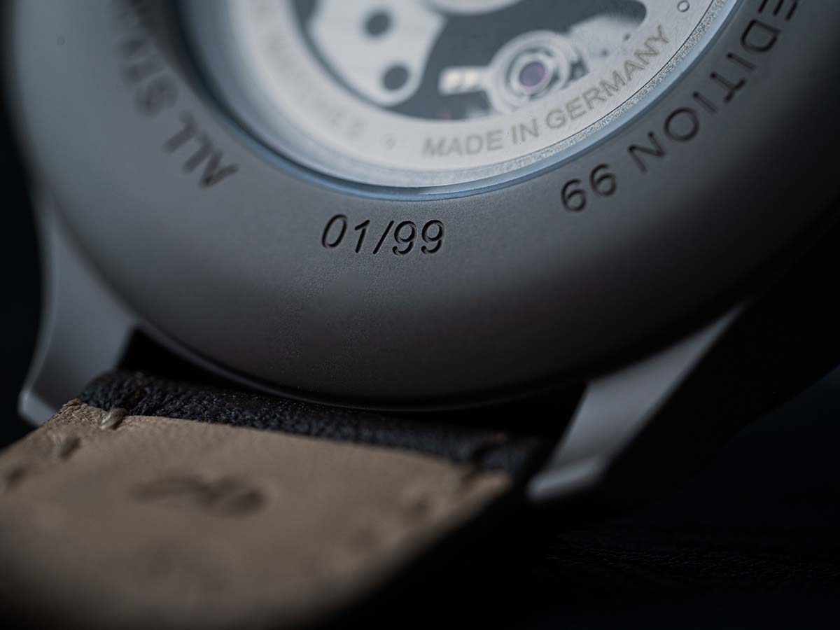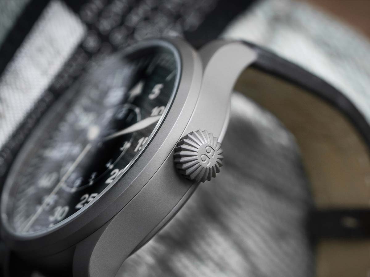 - Stainless steel case, dark sandblasted, sapphire crystal, knurled crown with raised "99"