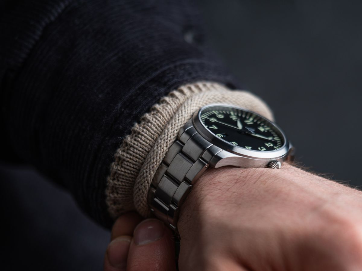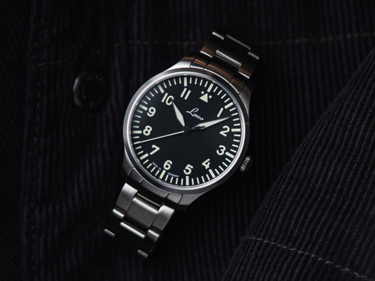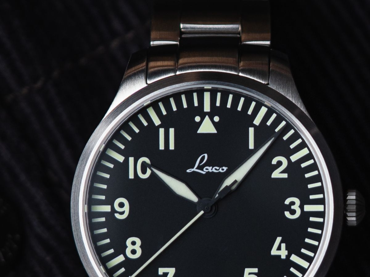 The dial with its design in the simple Baumuster A, which is characterised by a large hour circle and the typical triangle with two dots at 12 o'clock, means that the pilot's watch DNA is not neglected in this Laco entry-level model.