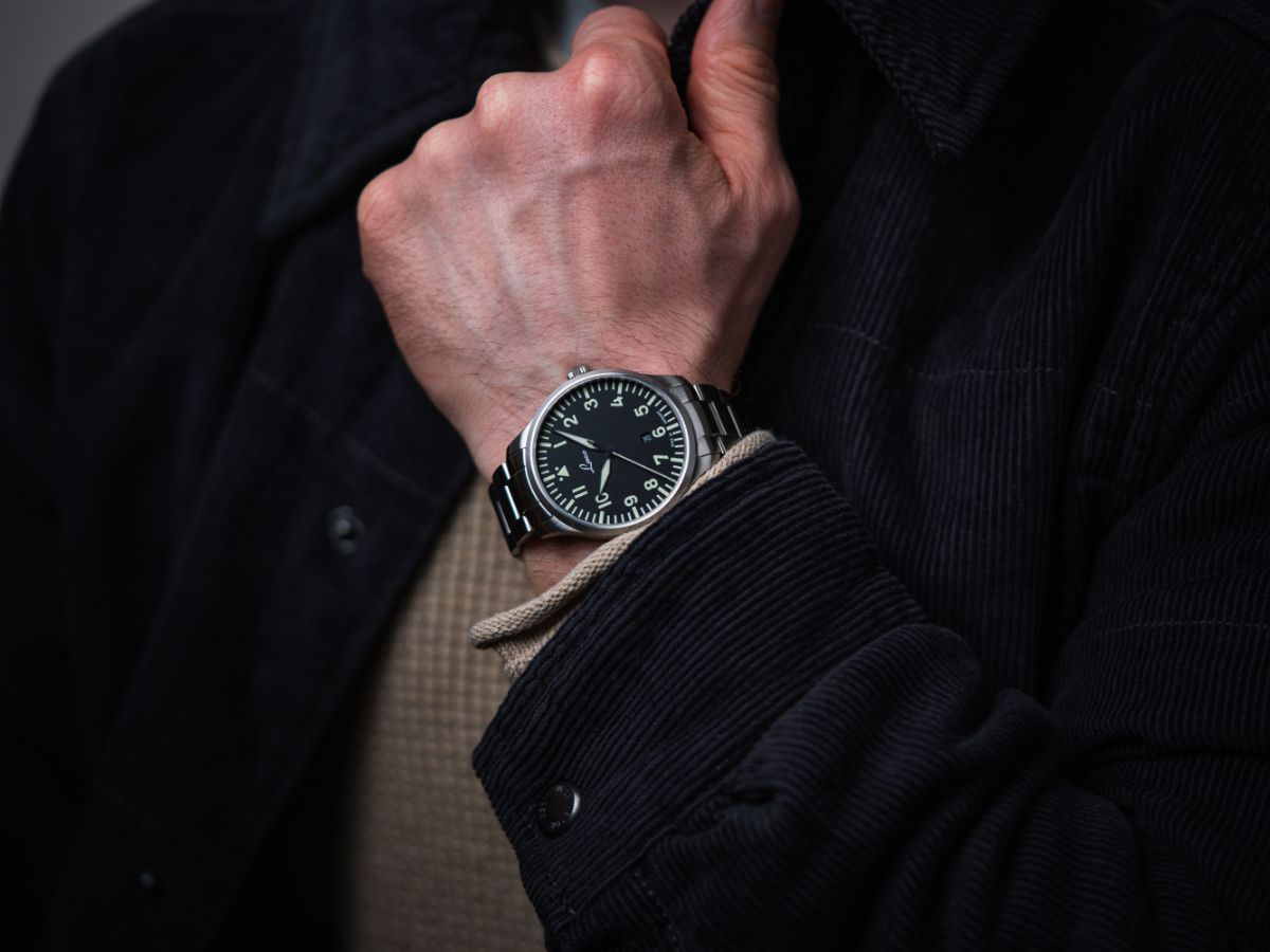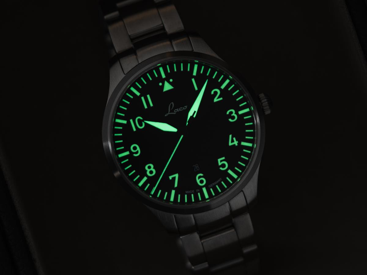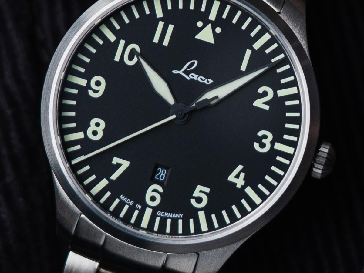 The dial with its design in the simple Baumuster A, which is characterised by a large hour circle and the typical triangle with two dots at 12 o'clock, means that the pilot's watch DNA is not neglected in this Laco entry-level model.