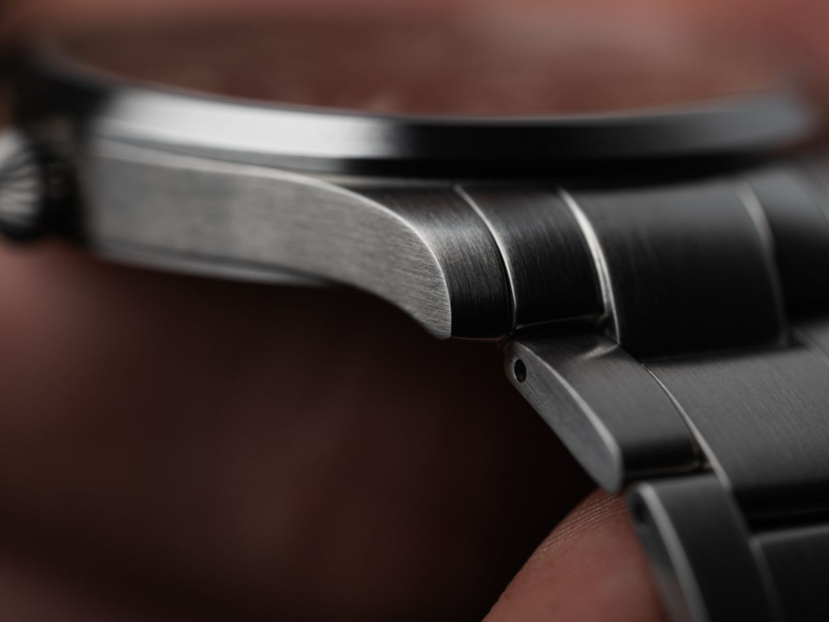 - Stainless steel, brushed finish, sapphire crystal, steel case-back, domed crown