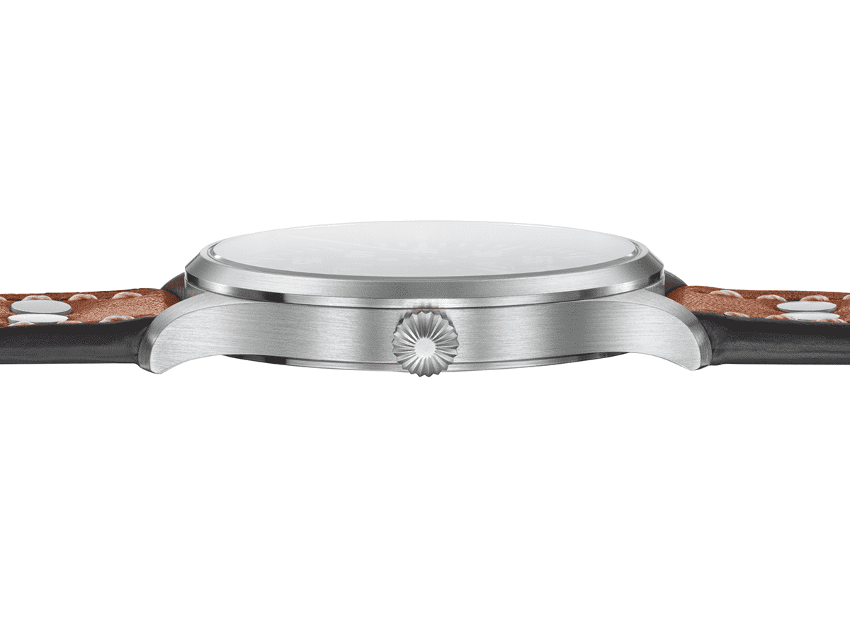 With the proven Laco design, a contemporary case diameter of only 40 millimetres and the high-precision quartz movement, it is a modern alternative to the original pilot's watches. With a height of only 9 millimetres, the Genf.2.D fits under the sleeve of a pilot's jacket as well as under a shirt cuff. The hands, numbers and indices are coated with Superluminova C3 for optimal readability. The Swiss quartz movement from Ronda with date display at 6 o'clock ensures precise timekeeping at all times.