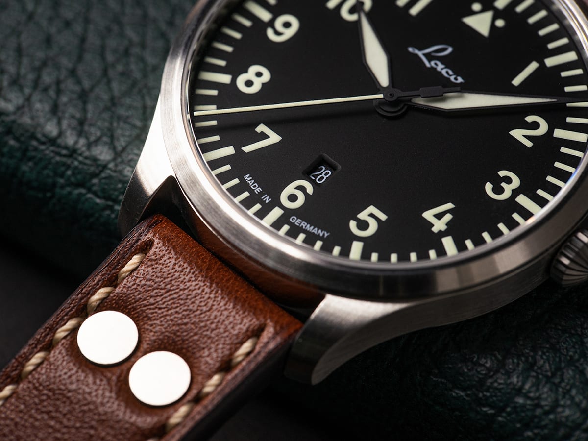 The dial with its design in the simple Baumuster A, which is characterised by a large hour circle and the typical triangle with two dots at 12 o'clock, means that the pilot's watch DNA is not neglected in this Laco entry-level model.