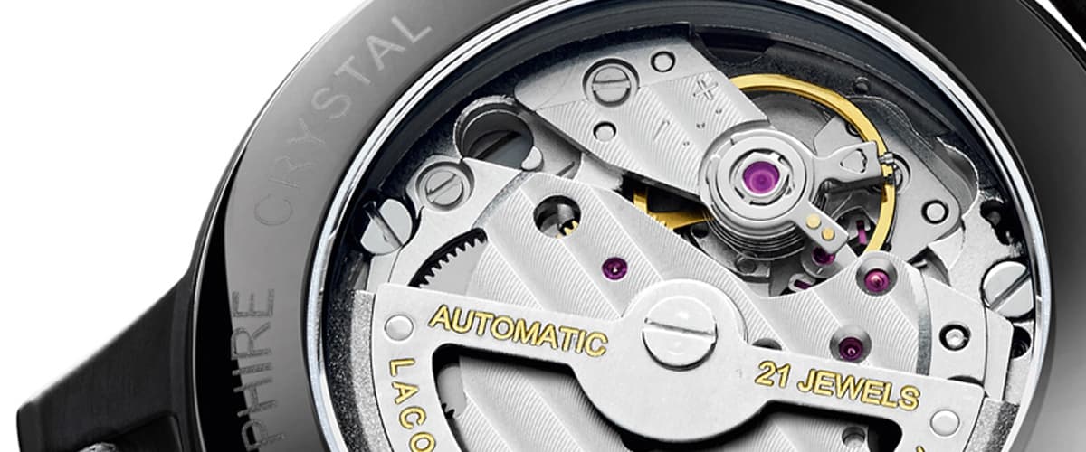 - Stainless steel, brushed finish, with black IP plating, sapphire crystal, sapphire crystal caseback, 5 ATM, case diameter 42 mm, domed crown, 20 mm lug width