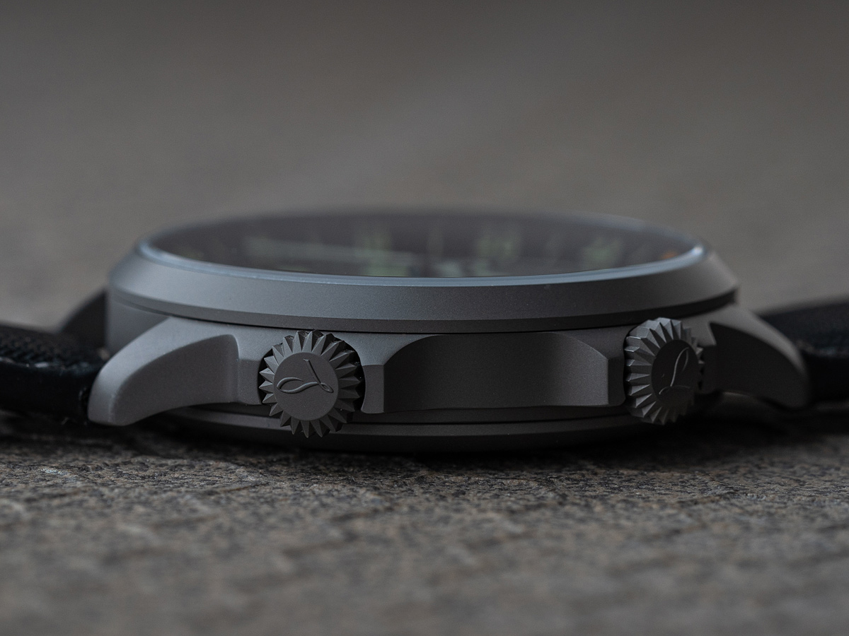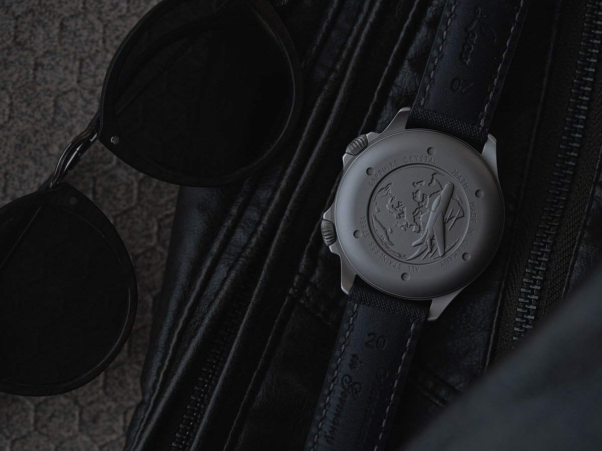 dark sandblasted stainless steel screwed base with aircraft relief, internal rotatable bezel, two protected and screwed crowns