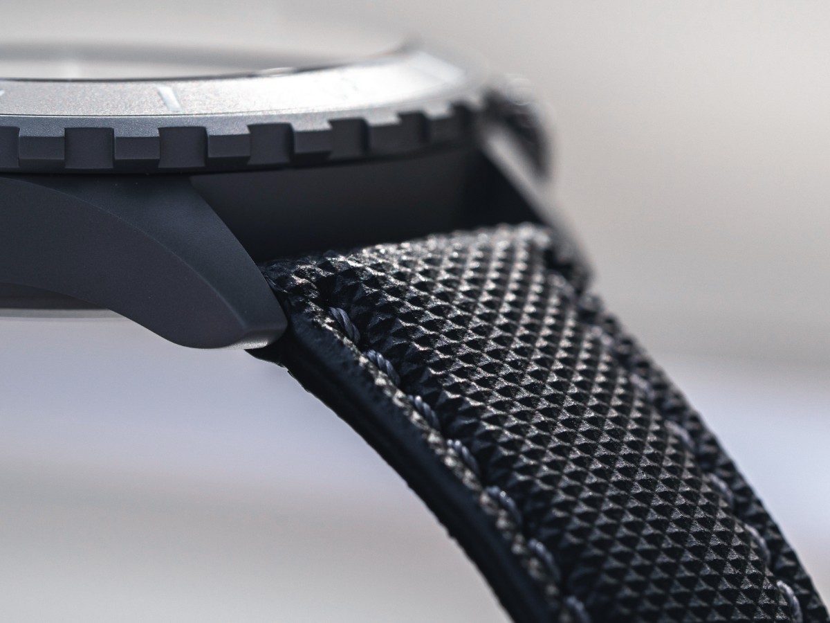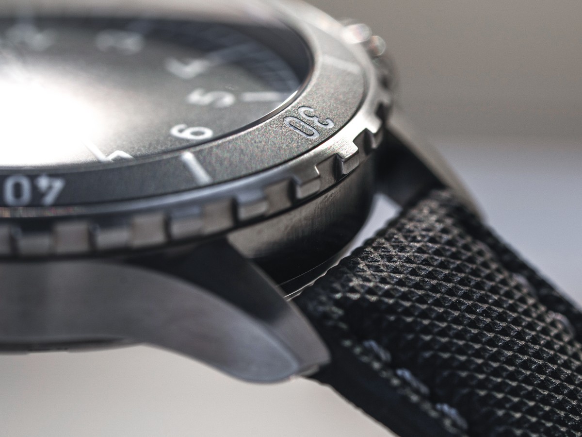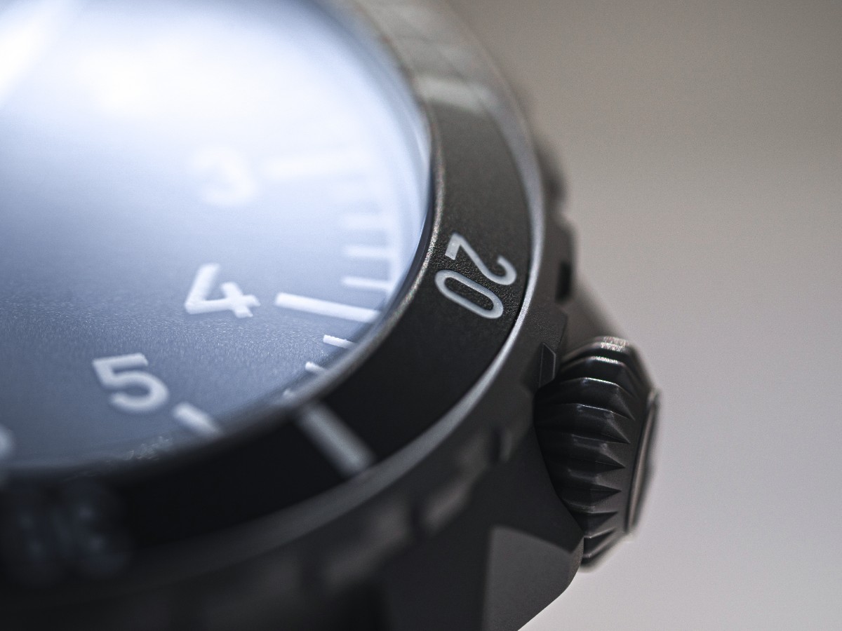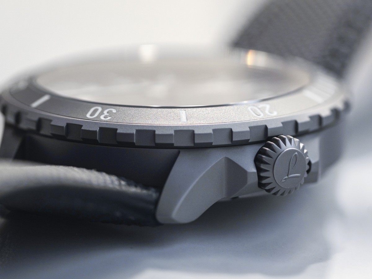 Dark sandblasted stainless steel case, double domed and anti-reflective sapphire crystal,