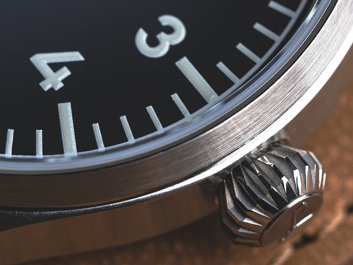 - Black mat, arabic figures and indexes with luminous material Superluminova C3, execution according original navigator watch with type A dial, small second at 6 h